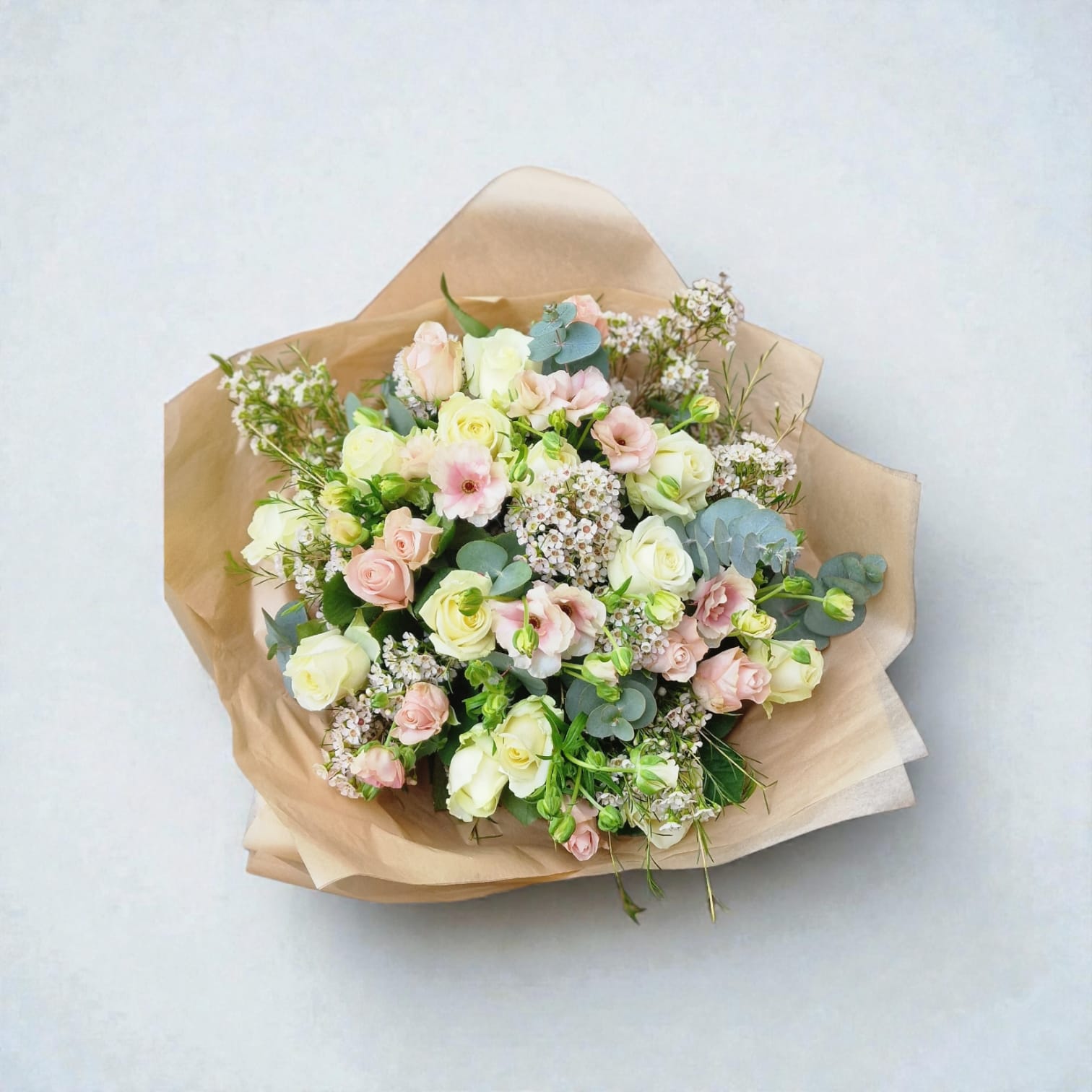 Prairie douce Ce bouquet raffiné et naturel aux douces teintes pastel allie roses crème et blush, fleurs rose pâle et feuillage vert frais, créant une ambiance aérienne et romantique. Emballé dans un papier kraft chaleureux, il respire la tranquillité, l'élégance et la douceur. Idéal pour surprendre, remercier ou instaurer une atmosphère chaleureuse et harmonieuse chez soi.
