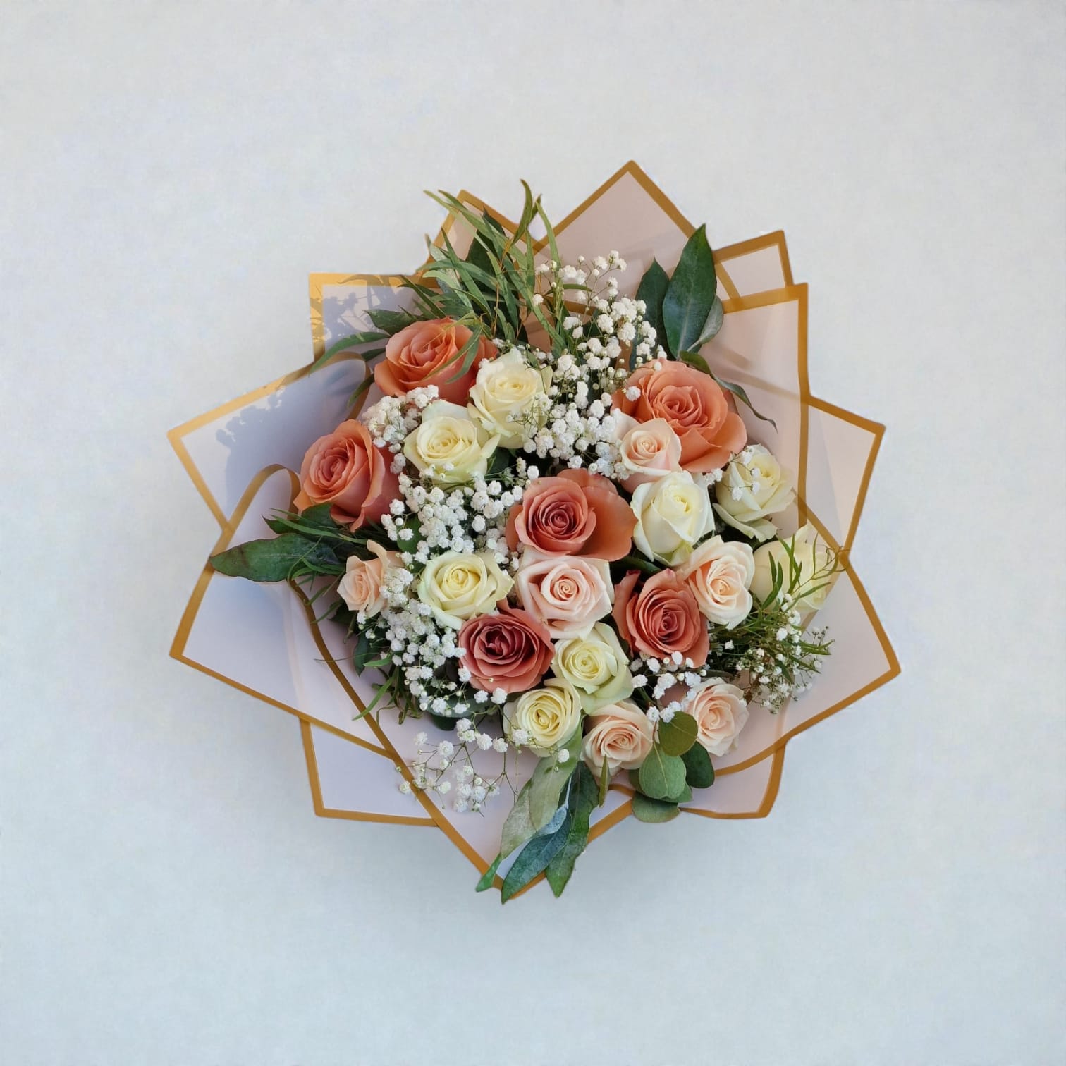 Ce bouquet élégant associe des roses délicates à du gypsophile fin et à de la verdure fraîche. L'harmonie des couleurs et le raffinement des finitions créent une ambiance romantique et intemporelle. Idéal pour surprendre, féliciter ou simplement apporter une touche de douceur et de chaleur à votre intérieur.