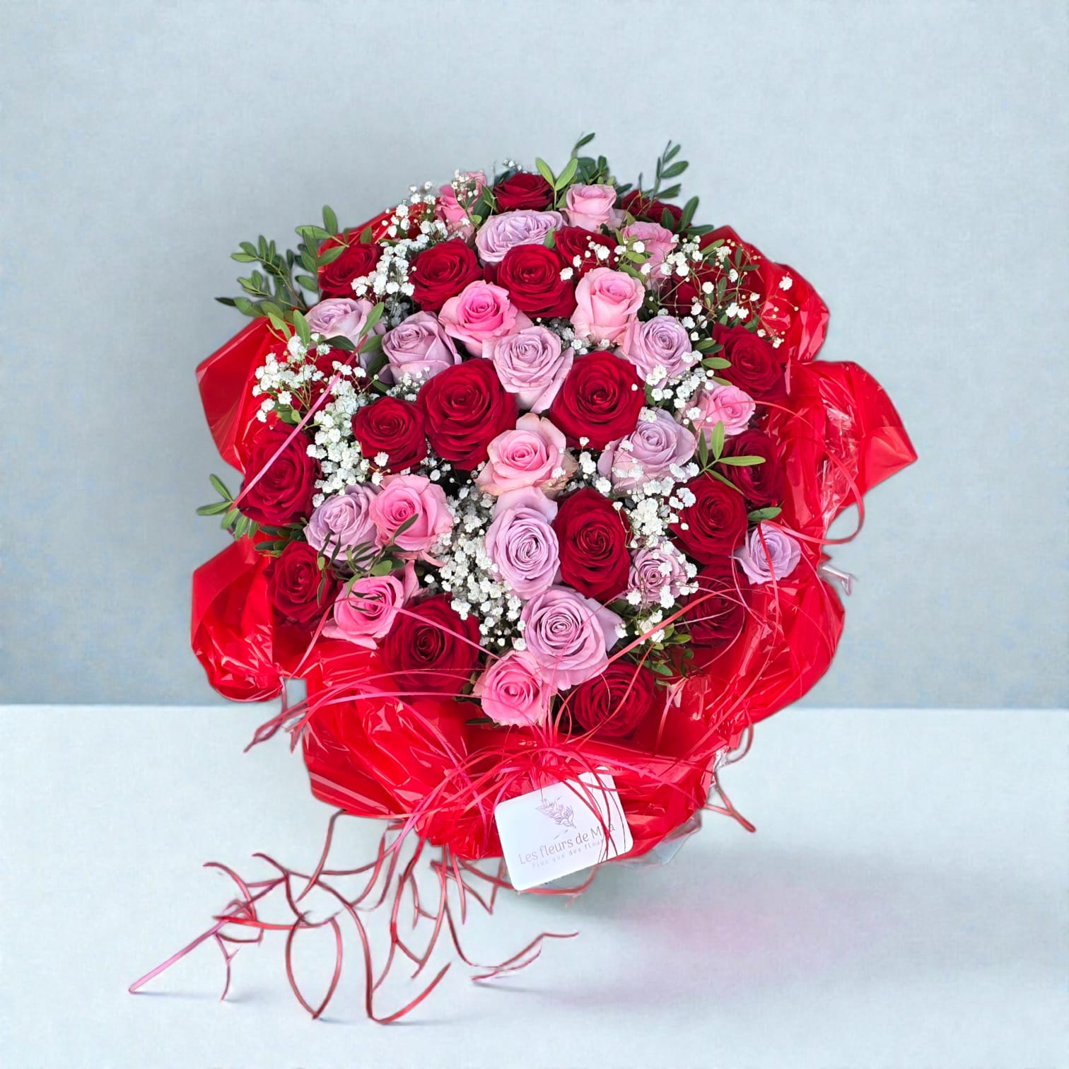Ce luxueux bouquet est une riche composition de roses rouges, roses et lilas tendre, harmonieusement associée à la délicatesse du gypsophile et à la fraîcheur de la verdure. Son emballage rouge vif et ses lignes gracieuses lui confèrent une allure résolument romantique et festive.