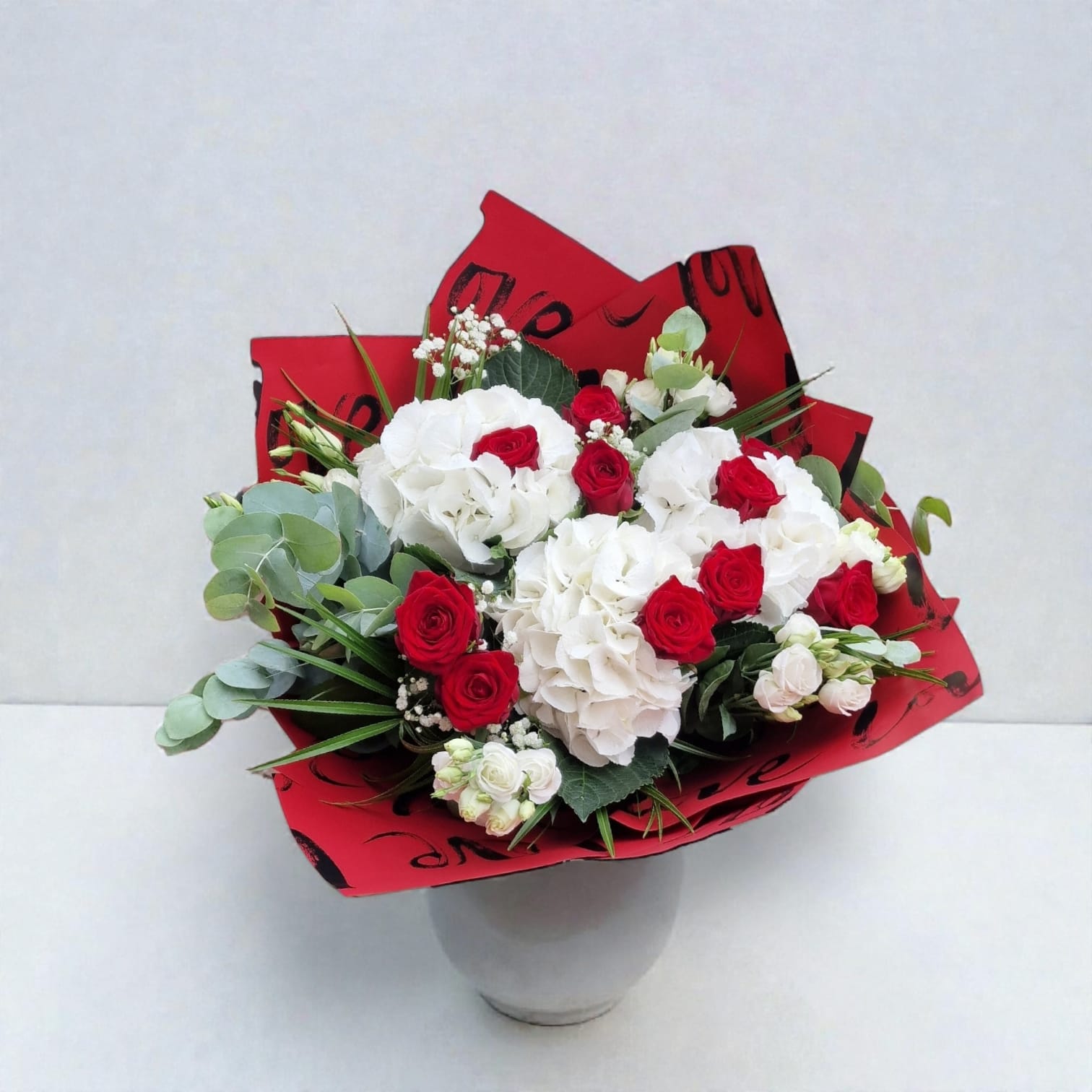 Ce bouquet élégant allie la beauté intemporelle de roses rouge foncé avec les formes douces et pleines de hortensias blancsLes teintes rouges symbolisent l'amour et la passion, tandis que le blanc évoque la tranquillité, le raffinement et l'équilibre. Agrémenté de verdure fraîche et d'un élégant papier d'emballage rouge, ce bouquet attire tous les regards.