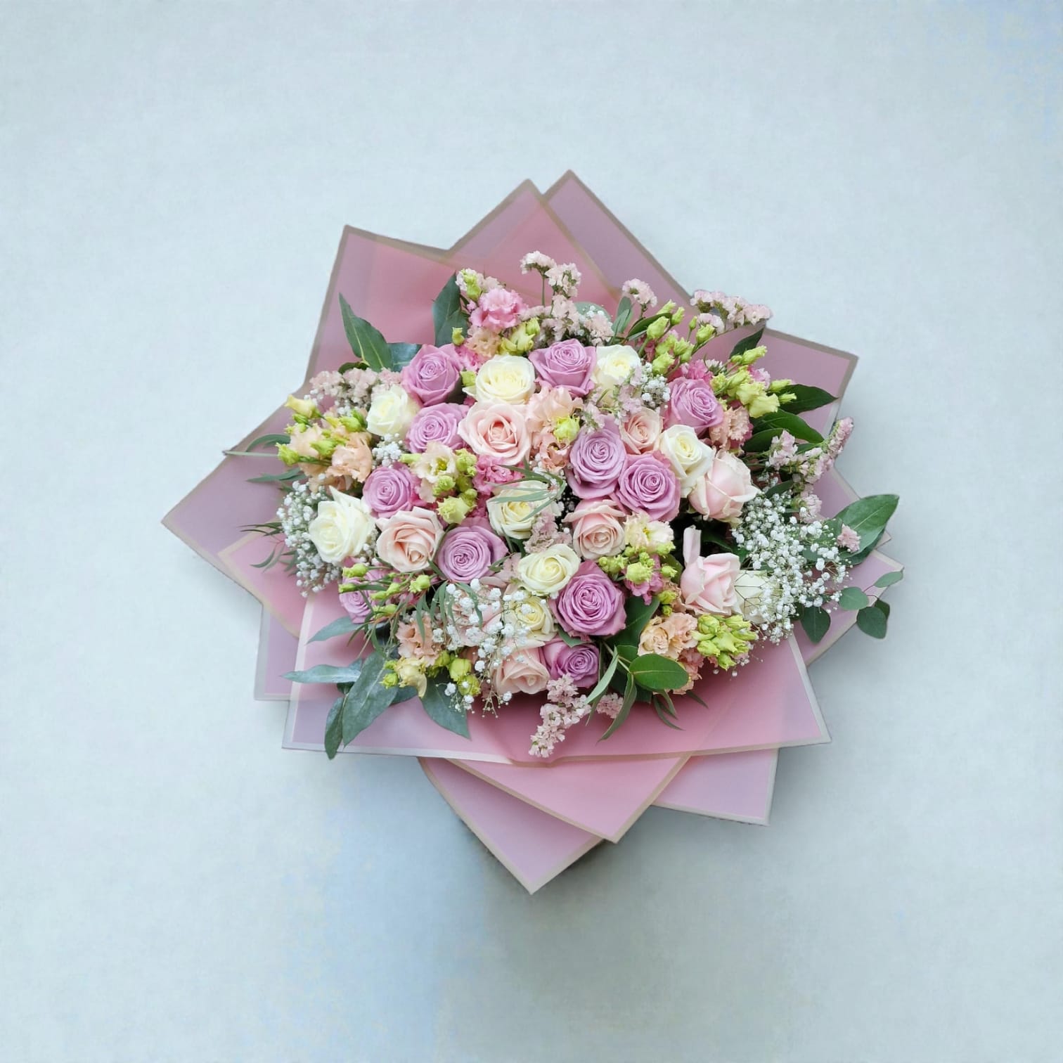 Ce bouquet élégant respire la douceur et le raffinement. Un harmonieux mélange de roses rose pastel, lilas et crème est sublimé par de délicates touches de gypsophile et de verdure fraîche. Son emballage rose à plusieurs niveaux renforce son caractère romantique et en fait le bouquet idéal pour un anniversaire, une naissance, un anniversaire de mariage ou simplement pour témoigner votre affection.