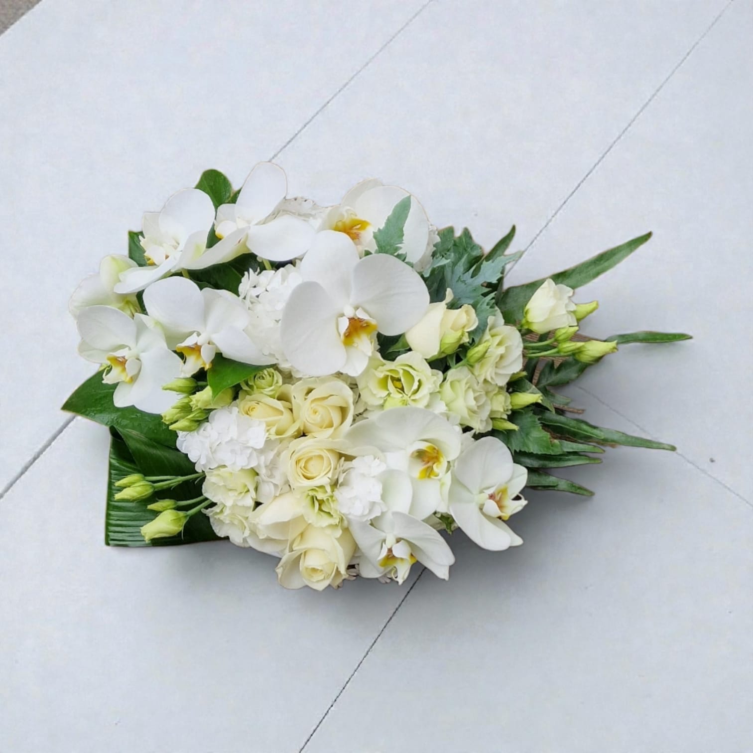 Cette composition florale raffinée respire la sérénité, le raffinement et une élégance intemporelle. Des orchidées blanches se marient harmonieusement à des roses crème et à un feuillage délicat, le tout présenté dans un élégant bol blanc. Sa forme basse et arrondie confère à l'ensemble une allure moderne et équilibrée.